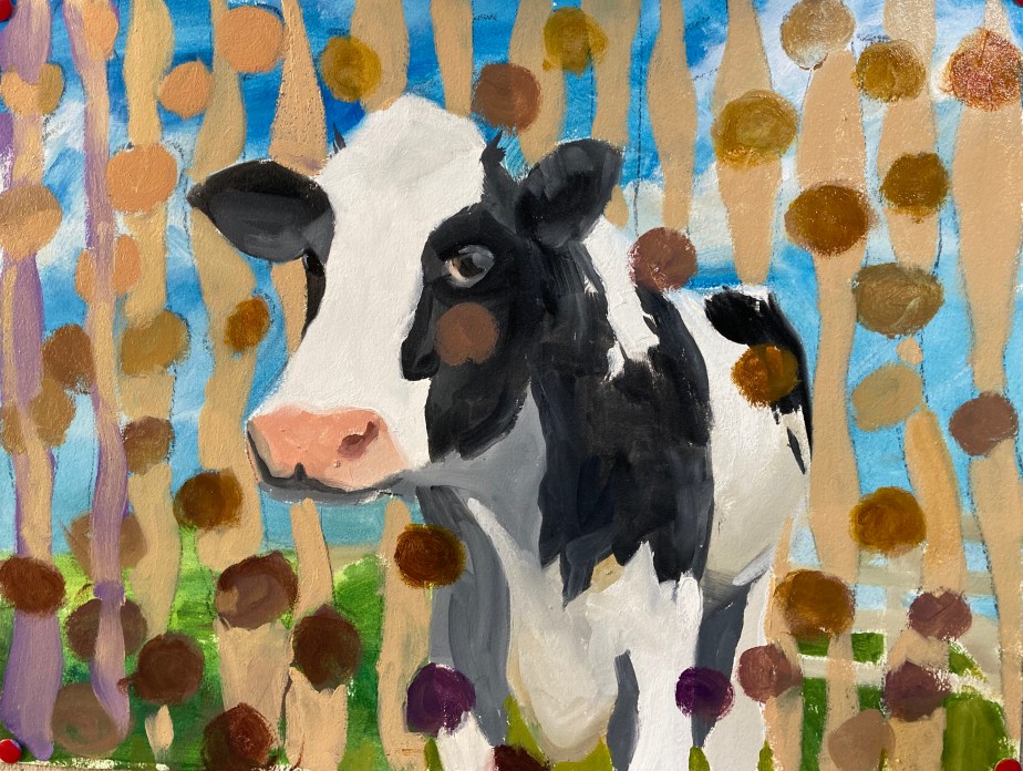 Cow Dream Fantasy A cow attempting to escape the real world. Oil on paper, 16×12. Share this: Click to email a link to a friend (Opens in new window) Email Click to share on X (Opens in new window) X Like Loading...