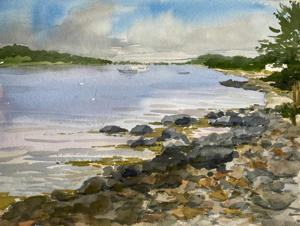 Mackerel Cove, Jamestown, RI, 12×16, watercolor plein air, Seascapes, Watercolor Share this: Click to email a link to a friend (Opens in new window) Email Click to share on X (Opens in new window) X Like Loading...